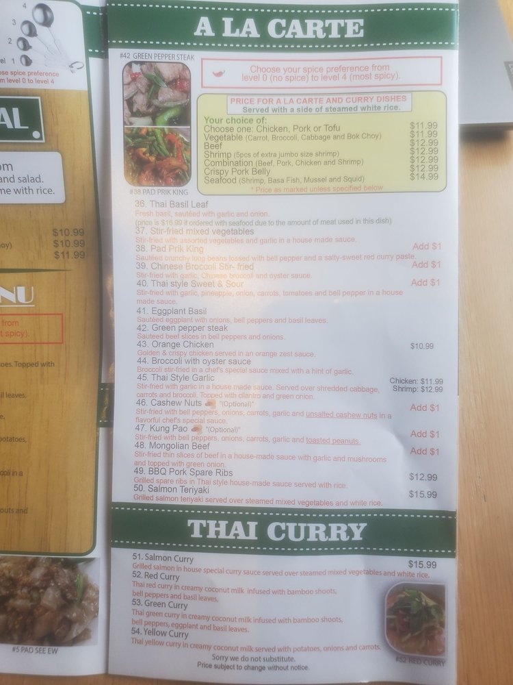 Your choice between Red, Yellow or green curry. Red curry - Thai red curry in creamy coconut milk infused with bamboo shoots, bell peppers and basil leaves.Yellow Curry : Thai yellow curry in creamy coconut milk served with potatoes, onions and carrots. Green Curry : Thai green curry in creamy coconut milk infused with bamboo shoots, bell peppers, eggplant and basil leaves. All of curry dish can be slightly spicy for someone who may not like any spice at all. Because it made of curry paste.