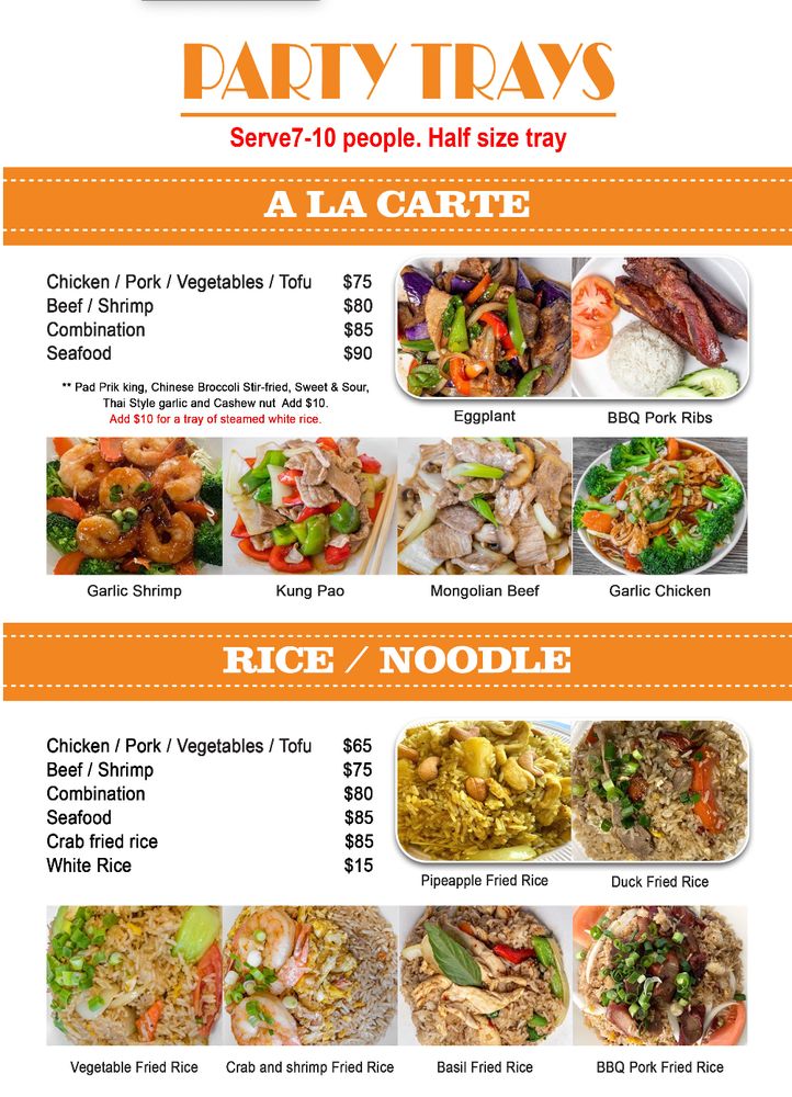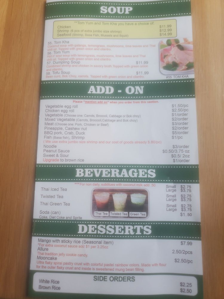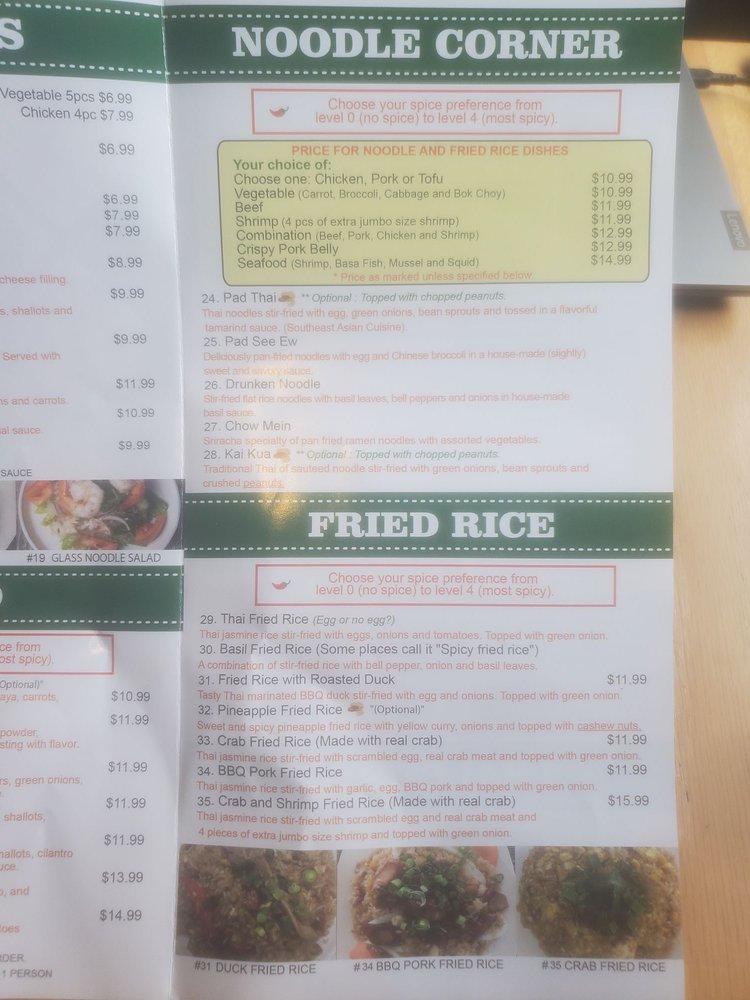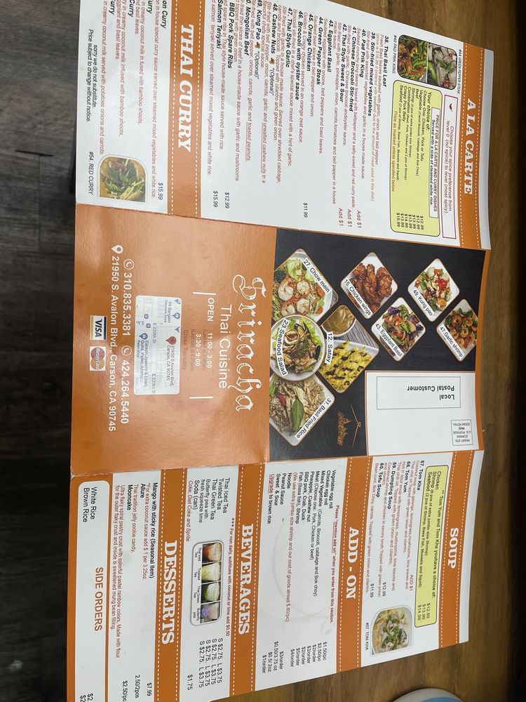 Sriracha Thai, located in Carson, CA, offers a delightful selection of Thai cuisine in a cozy setting. The menu features a variety of dishes, including seafood Tom Yum, crab fried rice, and beef fried rice that are highly recommended by satisfied customers. The restaurant offers vegan options, waiter service, and convenient online ordering for takeout. Customers appreciate the generous portion sizes, flavorful food, and personalized spice levels. The intimate dining area creates a welcoming atmosphere, while the efficient service and friendly staff enhance the overall dining experience. Whether you prefer a spicy green curry or a soothing Thai iced tea, Sriracha Thai is a must-try for authentic Thai flavors in the area.