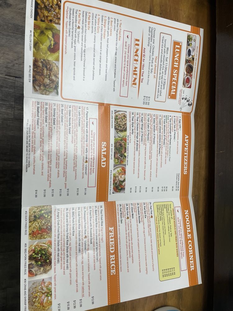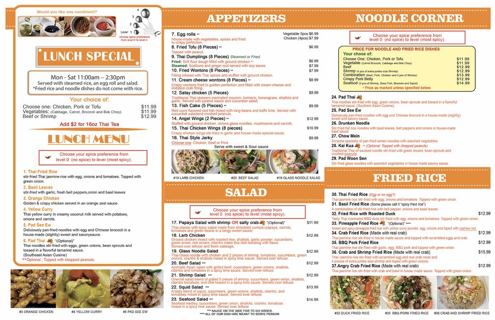 Stir- fried flat rice noodles with bell peppers and onions in spicy house made basil sauce.Note All noodle dish will dried out after awhile. It more enjoyable for dine in experience. Because We can't control how fast/slow you will get your food delivery. We recommend A la carte, soup and curry over noodles for all delivery order.